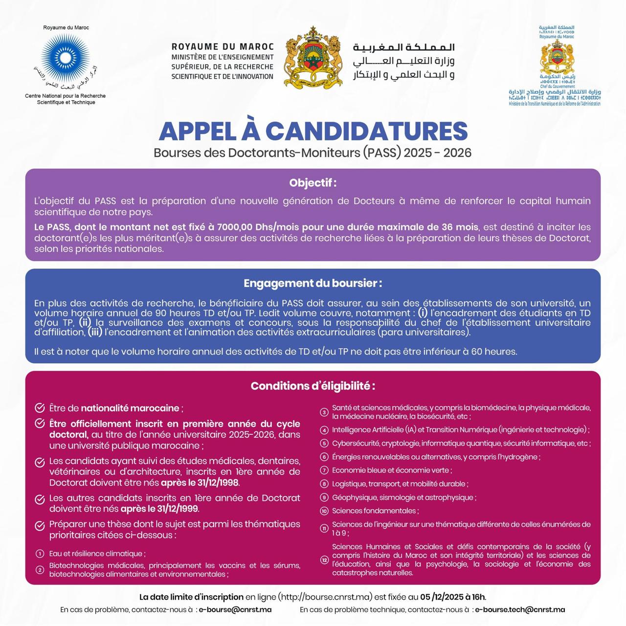 Le Ministère de l’Enseignement Supérieur, de la Recherche Scientifique et de l’Innovation et le Centre National pour la Recherche Scientifique et Technique (CNRST) lancent, au titre de l’année universitaire 2025-2026, le troisième appel à candidatures relatif aux 1200 bourses Doctorants-Moniteurs (PhD-Associate Scholarship – PASS) dont 200 bourses sont cofinancées par le Ministère Délégué auprès du Chef du Gouvernement, chargé de la Transition Numérique et de la Réforme de l'Administration.