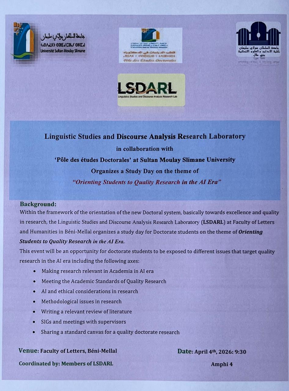 Linguistic Studies and Discourse Analysis Research Laboratory in collaboration with 'Pôle des études Doctorales' at Sultan Moulay Slimane University Organizes a Study Day on the theme of "Orienting Students to Quality Research in the Al Era"