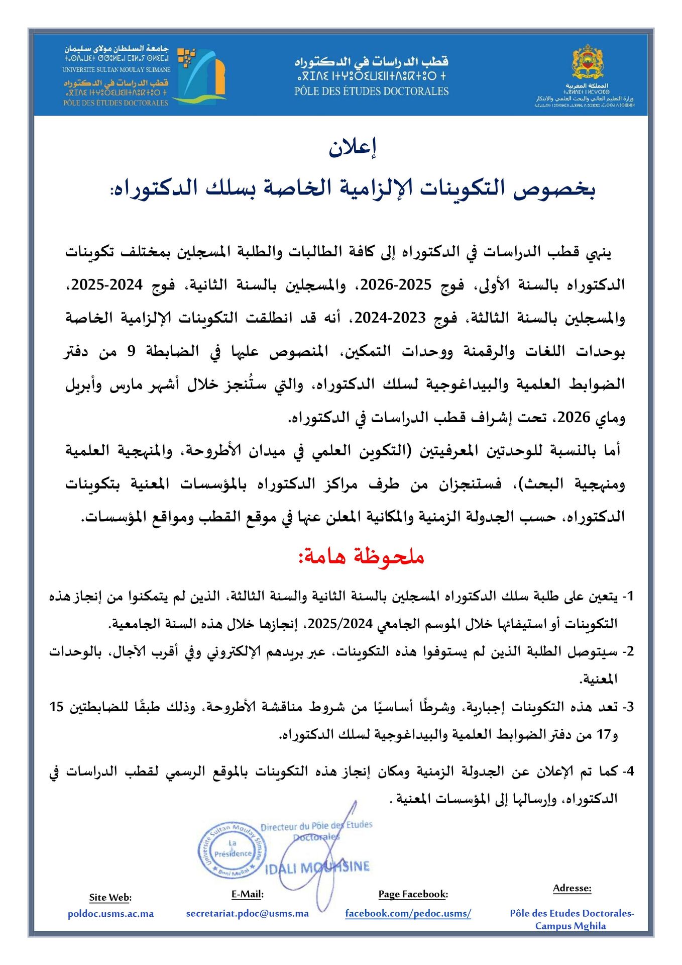 📢 Planning des enseignements des modules obligatoires du cycle doctoral